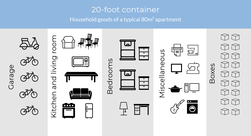 The dimensions of a 20 foot container measures 5.898m (L) by 2.352m (W) by 2.393m (H). Its capacity is 32.6m 3, which can generally take in everything needed for an 20-foot two apartment. It includes all appliances and furniture in the living area and kitchen, as well as bedrooms, bicycles or motorcycles, and 20 boxes.