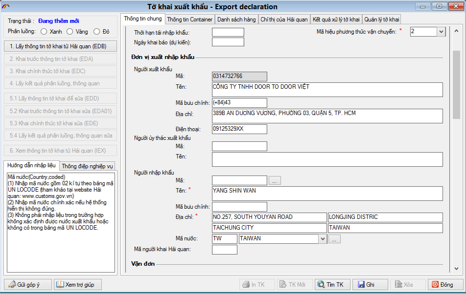 Sau khi nhập các thông tin cần thiết vàn tab thông tin chung thì bạn sẽ chuyển sang nhập thông tin vào tab danh sách hàng – đây là mục bạn sẽ điền tất cả các thông tin liên quan đến phần hàng hóa. Bạn cần phải khai báo chính xác các thông tin về tên hàng, nhãn hiệu cũng như xuất xứ, khối lượng, giá trị hàng hóa, mã biểu thuế và các loại thuế khác nếu có. Tiếp theo là bạn truyền tờ kê khai hải quan và cuối cùng là lấy kết quả phân luồng và in tờ khai hải quan nhập khẩu.