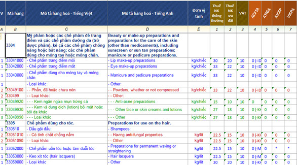 – Mã HS: đa số các sản phẩm mỹ phẩm đều có mã HS thuộc tiểu mục 3304 “Mỹ phẩm hoặc các chế phẩm để trang điểm và các chế phẩm dưỡng da (trừ dược phẩm), kể cả các chế phẩm chống nắng hoặc bắt nắng; các chế phẩm dùng cho móng tay hoặc móng chân”